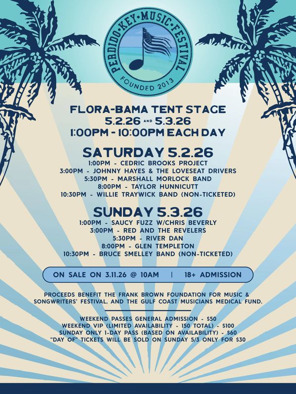 NO COOLERS and NO OUTSIDE FOOD OR ALCOHOL will be allowed. Perdido Key Music Festival looks forward to seeing you and hopes that you ENJOY PKMF 2026! Admission for age18+.
